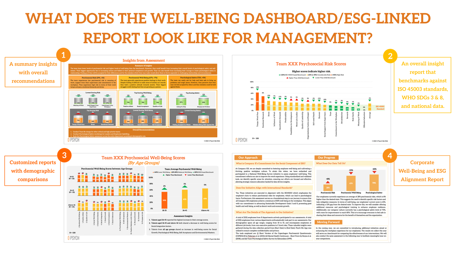 Benchmark your employees against ISO 45003, WHO SDG 3 & 8, and national data to gauge their well-being and performance.